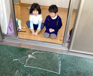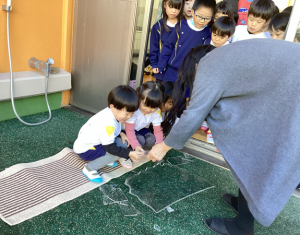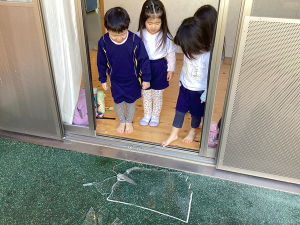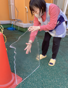 2階プールにかけてあるプールカバーに水たまりができていたので、水を抜きに行ってみると、分厚い天然の氷ができていました。近くを通りかかった子ども達も「何それ~?」「冷た~い!」と興味深々で、見たり触ったりして感触を楽しんでいました。こんなに大きな氷を見る機会はあまりないのでとてもいい体験になりました。