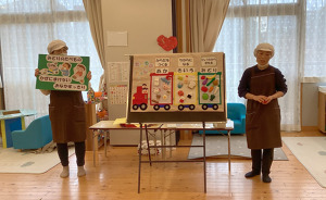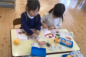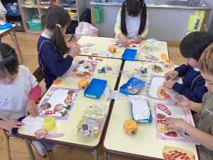 1月29日にらいおん・ぞう組でクッキングがありました。栄養士の先生に、食べ物が体の中に入ってから「うんち」になるまでの話しや、3色食品群をわかりやすく説明してもらいました。空っぽのお弁当箱に好きな食べ物を選んで貼っていく制作では3色食品群の赤・黄・緑をバランスよく選びながら、おいしそうなお弁当が出来上がっていました。その後は、パン・野菜・卵なと3食入っているサンドイッチを作りました。自分で作ったサンドイッチは特別だったようで、苦手な物があっても美味しそうにパクパク食べてました。