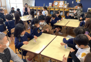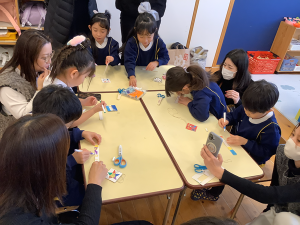 1月14.15日にらいおん・ぞう組の保育参観がありました。親子製作を行い、牛乳パックで「ぶんぶんコマ」と「竹とんぼ」を作りました。普段からよく廃材遊びをしている事もあってか、慣れた手つきで模様を描き、ハサミで切って、テープで貼るなど手際よく作っていました。出来上がった「ぶんぶんコマ」を回すのには、コツがいるようで子ども達は何度も挑戦していましたが、そこはさすがお家の方々。とても上手に音がなるくらいびゅんびゅん回していました。牛乳パックで羽を作りストローで軸を作った「竹とんぼ」は、飛ぶかな…と心配でしたが、くるくるっと回りよく飛んで親子でたくさん遊べました。