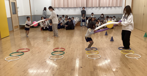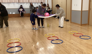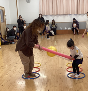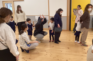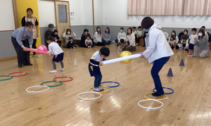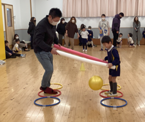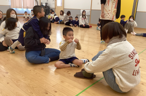 1月28・29日に、くま・きりん組の保育参観がありました。親子でジェスチャーゲームをしたり、ボール運びゲームをして楽しみました。ジュエスチャーゲームは、特徴をつかんで真似しているな~と思えば、途中で「あれれ…?」と変わってしまったりと、回りで見ていても面白く笑ってしまうほどでした。ボール運びゲームでは、息を合わせないと上手く進めず声を掛け合いながら進んでいる姿が印象的でした。どちらのゲームも身体を使ったあそびだったので親子でスキンシップをとりながらゲームを楽しんでいました。