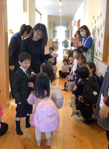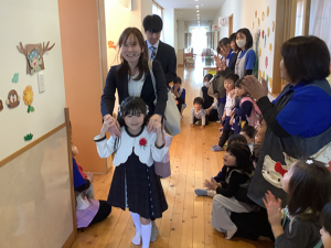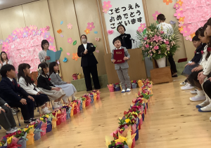 3月21日らいおん・ぞう組の卒園式がありました。少し緊張している様子で入場していた子ども達でしたが、保育証書授与の時には、大きな声で返事をし、ひとりで堂々と歩き証書をしっかりと受け取る姿は輝いていました。「お別れの言葉と歌」では、1年間の思い出をみんなで言葉にしながら伝え、元気な歌声もきかせてくれました。園生活最後の大きな行事という事もあり、とても感動した式になりました。子ども達の成長を保護者の皆様と一緒に近くで見させて頂くことができ、職員一同、感謝の気持ちでいっぱいになり。ありがとうございました。