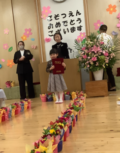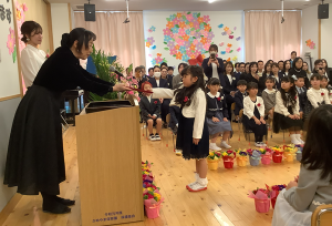 3月21日らいおん・ぞう組の卒園式がありました。少し緊張している様子で入場していた子ども達でしたが、保育証書授与の時には、大きな声で返事をし、ひとりで堂々と歩き証書をしっかりと受け取る姿は輝いていました。「お別れの言葉と歌」では、1年間の思い出をみんなで言葉にしながら伝え、元気な歌声もきかせてくれました。園生活最後の大きな行事という事もあり、とても感動した式になりました。子ども達の成長を保護者の皆様と一緒に近くで見させて頂くことができ、職員一同、感謝の気持ちでいっぱいになり。ありがとうございました。
