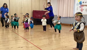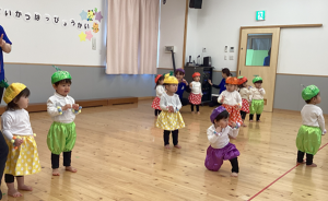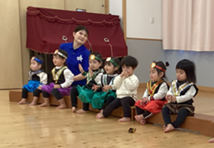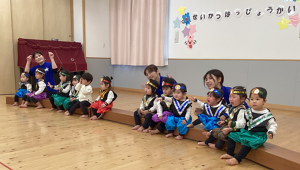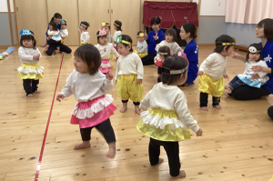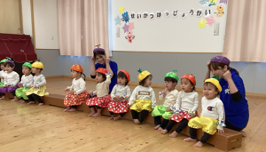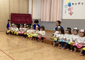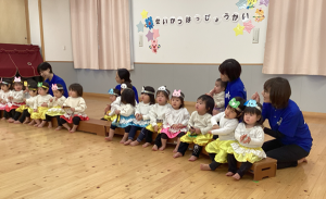 2月14日(土)に0.1歳児の生活発表会がありました。いつもお部屋でしている手遊びやリズム遊びを、かわいい衣装を着て発表しました。いつもと違う雰囲気にドキドキして泣いてしまう子もいましたが、音楽が流れると両手を振ったり、ちょっとだけポーズをとったりしていました。そんなかわいい姿に会場全体が和やかになり、とても温かい発表会となりました。
