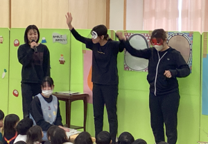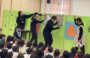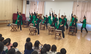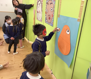1月のわくわく会は、「新年明けましておめでとう会」でした。ホールに集まりみんなで「明けましておめでとうございます。」と元気な挨拶から始まり、鏡餅って知ってる?お正月あそびはどんなものがあるでしょう?とお正月についての話を聞きました。たくさんあるお正月あそびの中から、今回は福笑いに挑戦。「もっと右!」「違う違う」と教える声も飛び交い、笑い声いっぱいのわくわく会でした。 新年おめでとう会の締めくくりに先生たちが、和太鼓「いろは」を演奏してくれました。迫力ある演奏に子ども達からたくさんの拍手を頂きました。